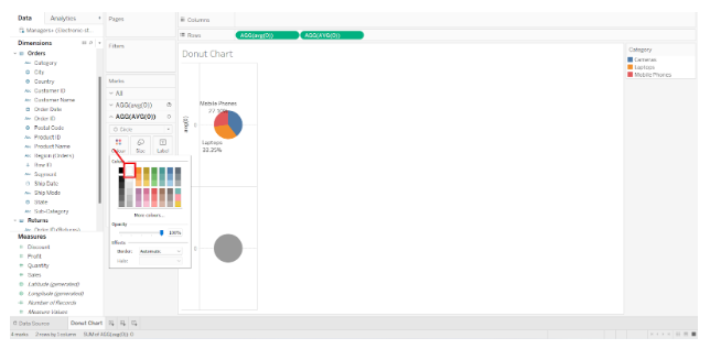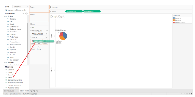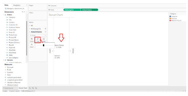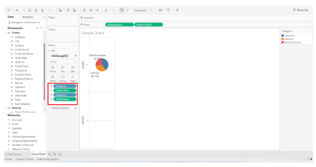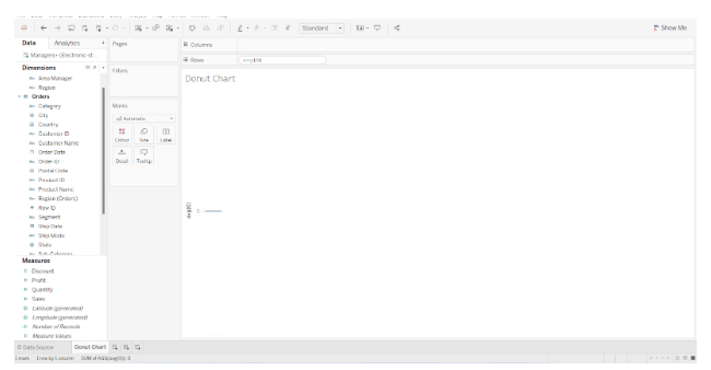 From the Marks list, we select Pie as the mark type for the first measure. In addition, by creating two aggregate measures, we have two sections for each measure in the Marks card. To create our Tableau donut chart, we will use these two sections discretely for both measures.