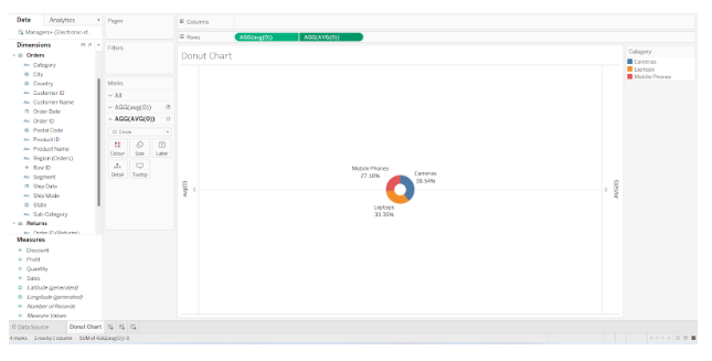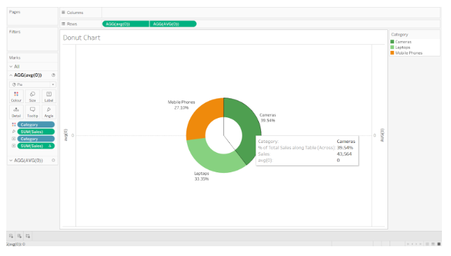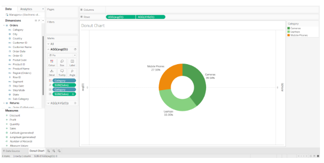 We could see a donut-shaped chart with three sections and data labels once we adjusted the inner white circle. The total sales value for all three categories is shown in the center of the donut chart.