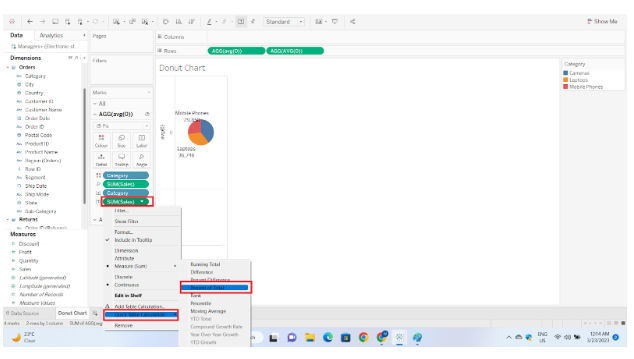 By right-clicking on the SUM(Sales) field, selecting the option Quick Table Calculation, and then selecting Percent of Total, we apply a Quick Table Calculation. This will display the percentage of total sales for each category in the chart’s labels.