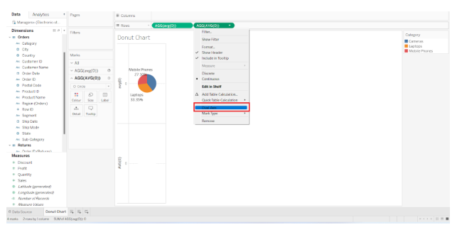 The next step is to combine these two charts and get closer to our final tableau donut chart. Select Dual Axis from the drop-down menu when right-clicking on a measure field name in the Rows section.