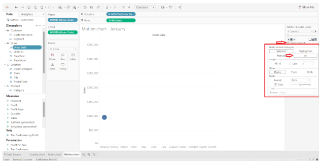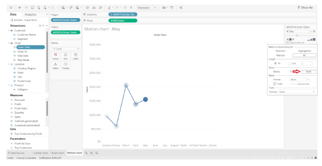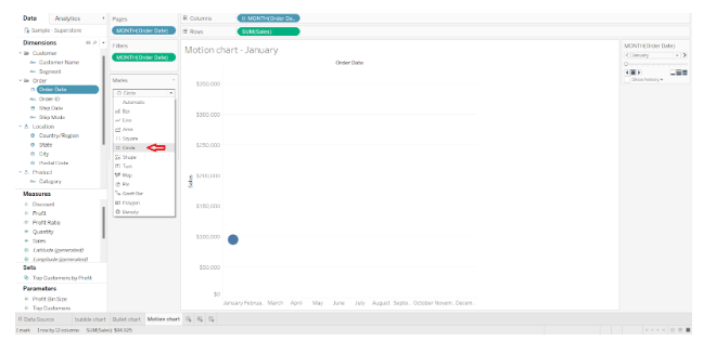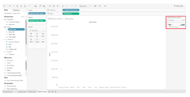 A filter and play box appear on the right after we add our dimension to the Pages section. From here, we can set a range of months or operate the motion chart with the tableau play-pause button.As we move forward, we will learn how to further utilize this filter-play box for our motion chart.