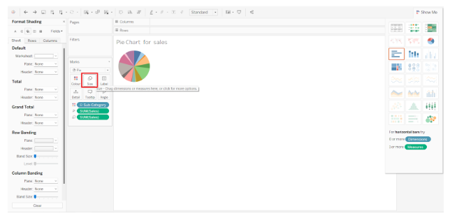 On the editing pane, you can see a small pie chart. By holding Shift+Ctrl and B, you can increase the pie chart’s size. Click on B several times to keep increasing the size until it reaches the size you want. Alternatively, you can perform this operation via the Size option under Marks.
