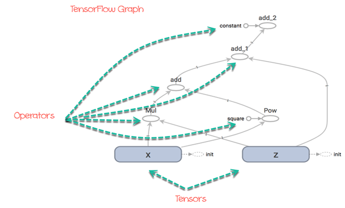 TensorFlow  uses an outstanding  approach for  rendering  the operation. All the computations are represented with a dataflow scheme. Dependencies between individual operation can be seen and visualize how the computations  are done using dataflow graph . Mathematical formula or algorithm are made of a number of successive operations. Graph does not display the output of the operations, it only helps to visualize the connection between individual operations.