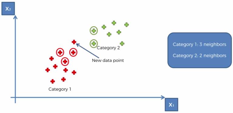 In the above diagram the knn dictates the new data point belonging to the red group(Category 1). Simply we can say that the K-nearest-neighbors algorithm estimates the new data point to be a member of one group or another group based on which group data points are nearer to that new data point.
