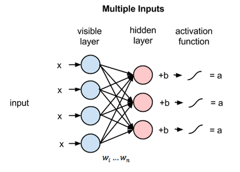 Each visible node takes a low-level feature from an item in the dataset to be learned. At node 1 of the hidden layer, x is multiplied by a weight and added to a so-called bias. The result of those two operations is fed into an activation function, which produces the node’s output, or the strength of the signal passing through it, given input x.
