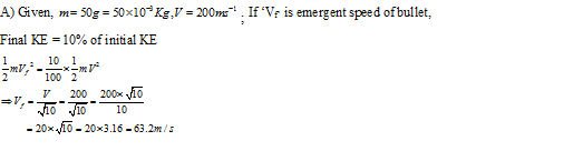 In a ballistics demonstration a police officer fires a bullet of mass 50.0g with speed of 200ms-1 on soft plywood of thickness 2.00cm. The bullet emerges with only 10% of its initial kinetic energy. What is the emergent speed of bullet?
