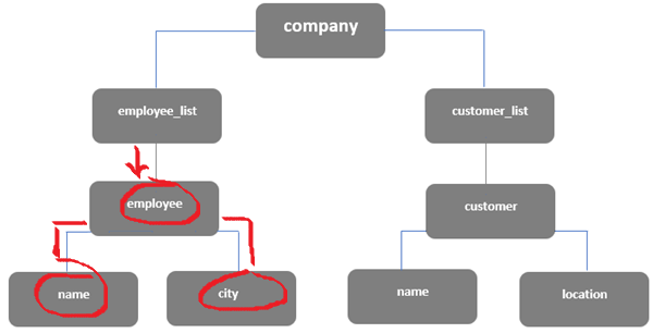 <?xml version="1.0" encoding="UTF-8"?> <company> <employee_list> <employee> <name> Hari</name> <city> hyderabad</city> </employee> <employee> <name> sneha</name> <city> banglore</city> </employee> </employee_list> <customer_list> <customer> <name> Sanjay</name> <location> Mumbai</location> </customer> <customer> <name> Micheal</name> <location> Washington</location> </customer> </customer_list> </company>