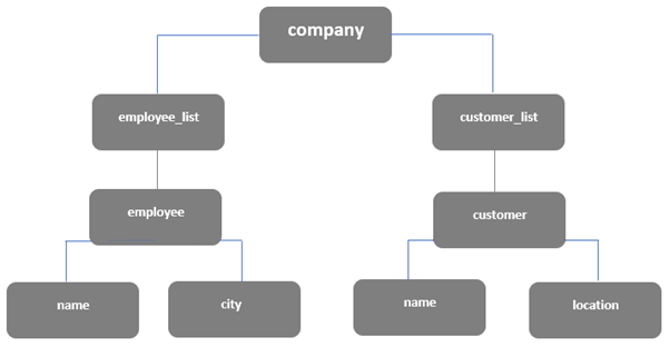 Here we can take an example of a company.xml which contains the information about their employee_list and customer_list as parent elements. where in turn those employee and customer parent elements carry the data inside the child elements called name, city, location.